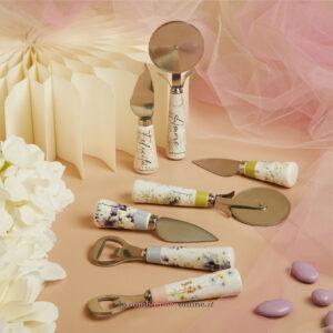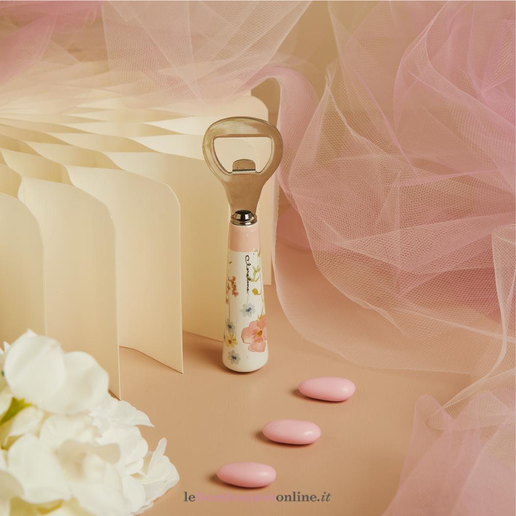 Apribottiglia manico in porcellana con decoro floreale rosa, h 13,5 cm, completo di porta confetti in tessuto con bottone madraperlato. Il prezzo indicato include la confezione con nastri in doppio raso, organza, o una combinazione di entrambe i materiali.