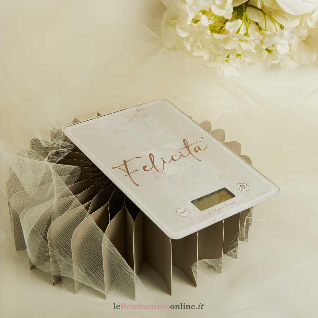 Bilancia in vetro con scritta “Felicità”, 15 x 22 x 2 cm, batterie non incluse nel prezzo, completa di porta confetti in tessuto con bottone madreperlato e scatola regalo Claraluna decoro coordinato. Il prezzo indicato include la confezione con nastri in doppio raso, organza, o una combinazione di entrambe i materiali.