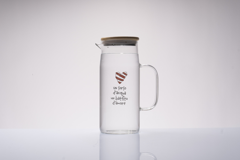 Brocca in vetro borosilicato + coperchio in legno con guarnizione, completa di sacchetto con confetti e scatola Cuorematto, cm Ø 9 x 20 H. Il prezzo indicato include la confezione con nastri in doppio raso, organza, o una combinazione di entrambe i materiali.