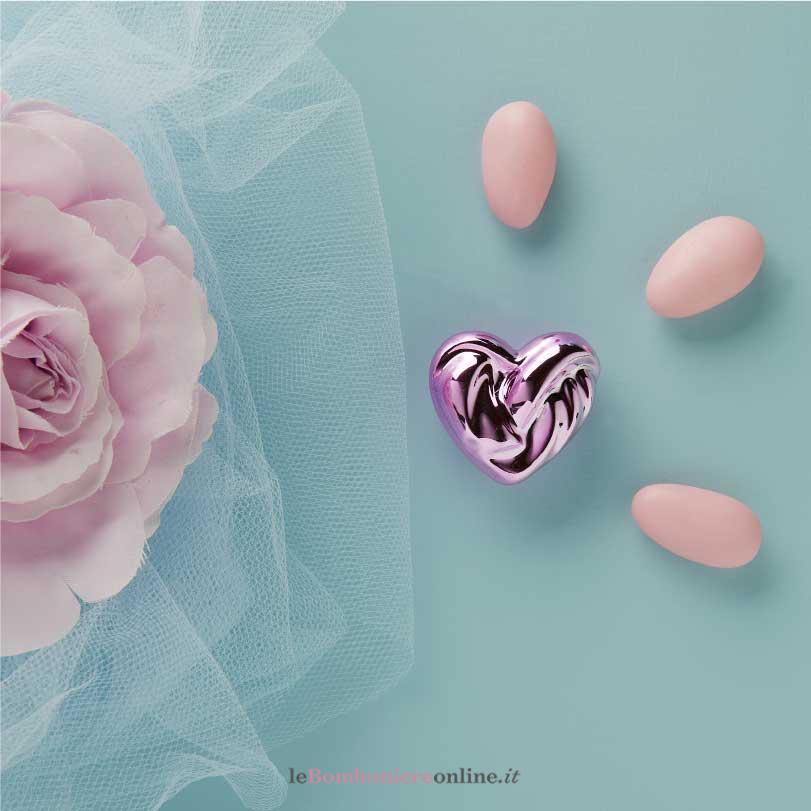 Cuore in porcellana rosa con calamita, 3.7 x 3.5 x 1.5 cm, disponibile anche in oro rosa/silver/oro/azzurro/bianco, completo di porta confetti. Il prezzo indicato include la confezione con nastri in doppio raso, organza, o una combinazione di entrambe i materiali.