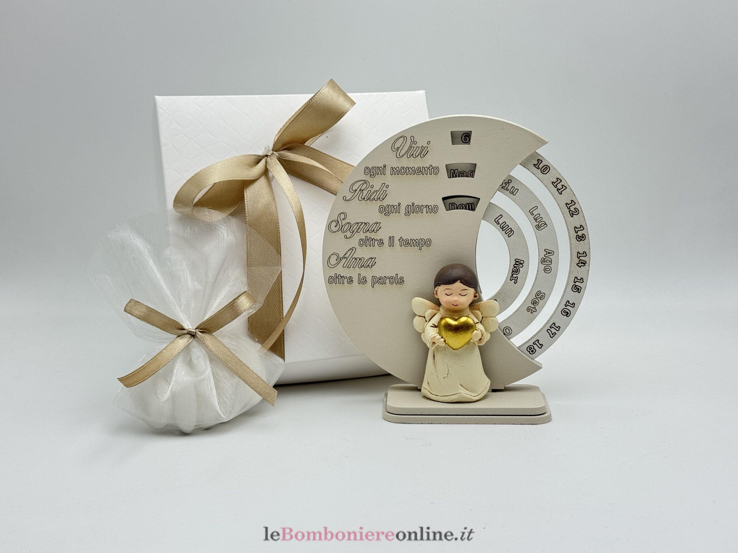 Calendario perpetuo in legno taglio laser, colore sabbia, con angioletto in resina, cm 12 x 4 x 13 H, completo di portaconfetti con confetti e scatola. Il prezzo indicato include la confezione con nastri in doppio raso o organza, o una combinazione di entrambe i materiali.