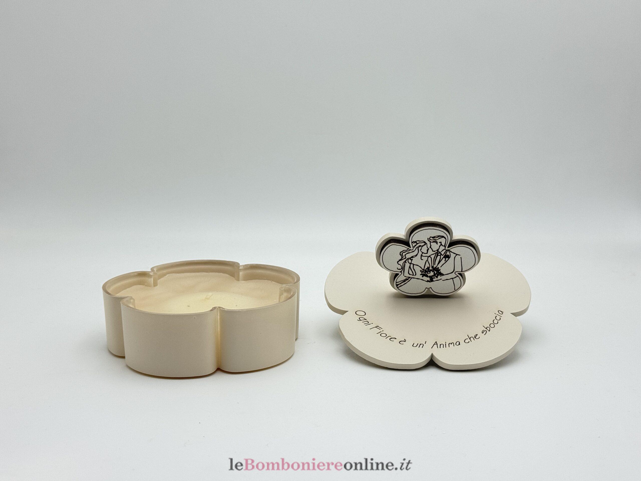 Scatola con candela, coperchio in legno taglio laser, decoro coppia sposi, colore sabbia, cm 10 x 10 x 7 H, completo di portaconfetti con confetti e scatola. Il prezzo indicato include la confezione con nastri in doppio raso o organza, o una combinazione di entrambe i materiali.