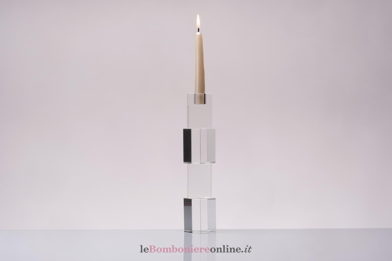 Candeliere in cristallo, cm 24 H, compreso di sacchetto porta confetti e la scatola regalo Morena Design. Il prezzo include la confezione con nastri in doppio raso, organza, o una combinazione di entrambe i materiali.