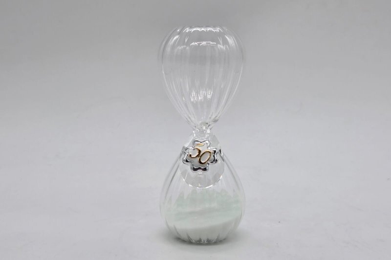 Clessidra in vetro soffiato con applicazione 50° Anniversario, cm 12 H, compreso di sacchetto porta confetti e la scatola regalo Morena Design. Il prezzo include la confezione con nastri in doppio raso, organza, o una combinazione di entrambe i materiali.