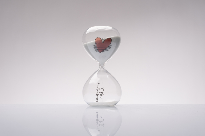 Clessidra in vetro borosilicato, completo di sacchetto con confetti e scatola Cuorematto, cm Ø 7 x 15 H. Il prezzo indicato include la confezione con nastri in doppio raso, organza, o una combinazione di entrambe i materiali.