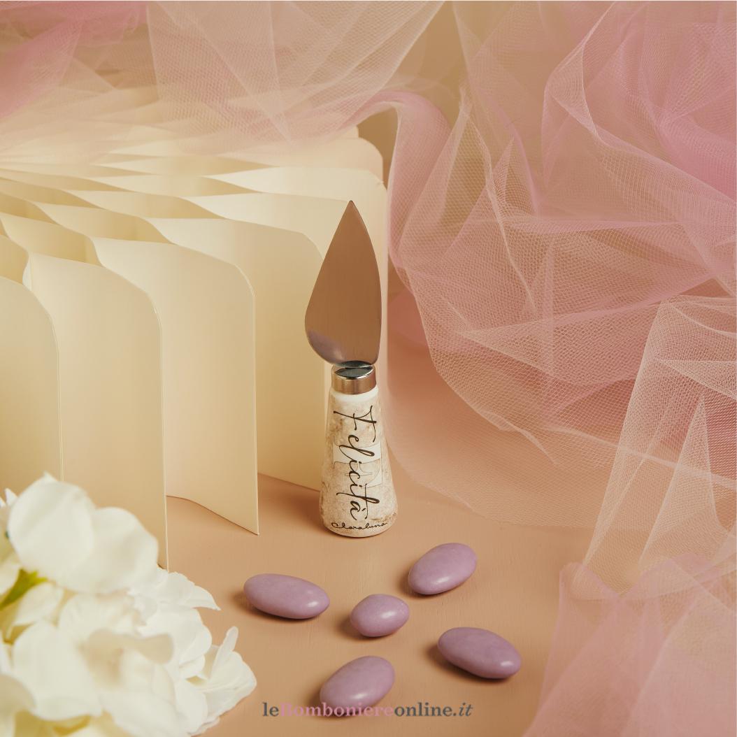 Coltellino da formaggi con manico in porcellana, decoro felicità, h 12,5 cm, completo di porta confetti e scatola. Il prezzo indicato include la confezione con nastri in doppio raso, organza, o una combinazione di entrambe i materiali.