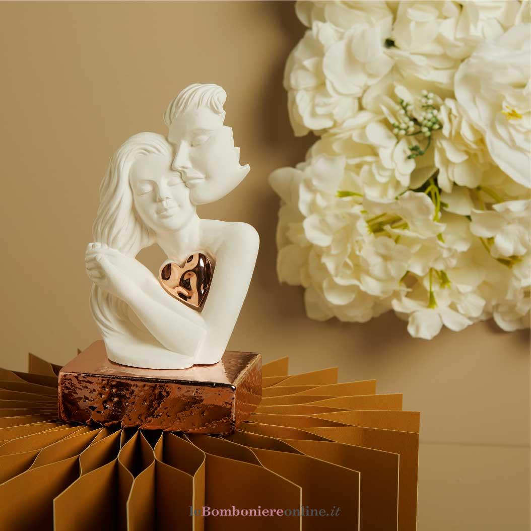 Coppia innamorati in gesso bianco con applicazione cuore su base porcellana oro rosa (disponibile base oro e silver), 7 x 17 x 7 cm, completa di porta confetti in tessuto con bottone madreperlato e scatola Claraluna decoro botanica oro. Il prezzo indicato include la confezione con nastri in doppio raso, organza, o una combinazione di entrambe i materiali.