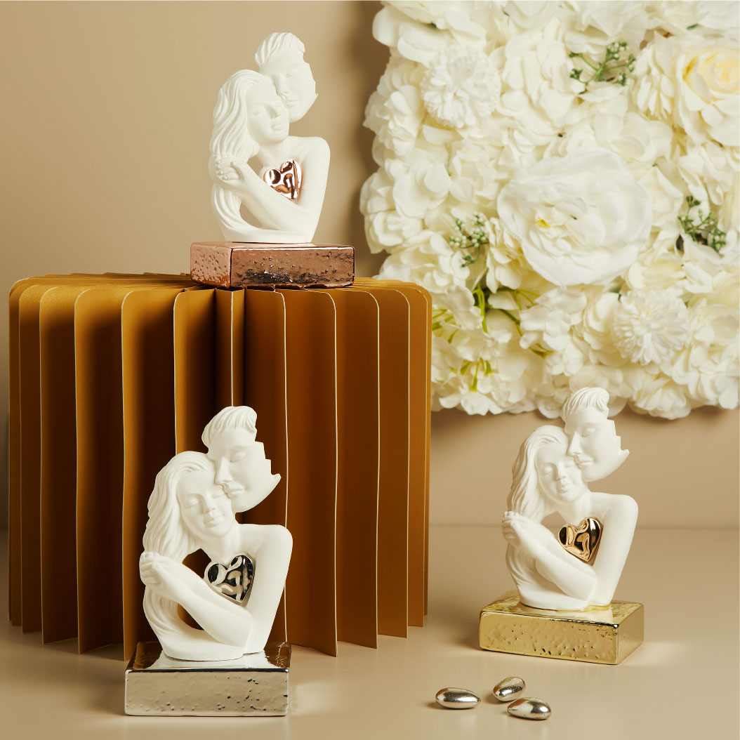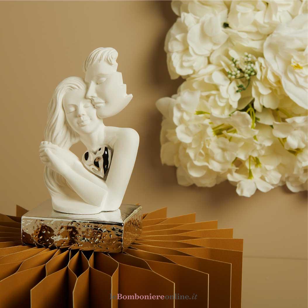 Coppia innamorati in gesso bianco con applicazione cuore su base porcellana silver (disponibile base oro e oro rosa), 7 x 17 x 7 cm, completa di porta confetti in tessuto con bottone madreperlato e scatola Claraluna decoro botanica oro. Il prezzo indicato include la confezione con nastri in doppio raso, organza, o una combinazione di entrambe i materiali.