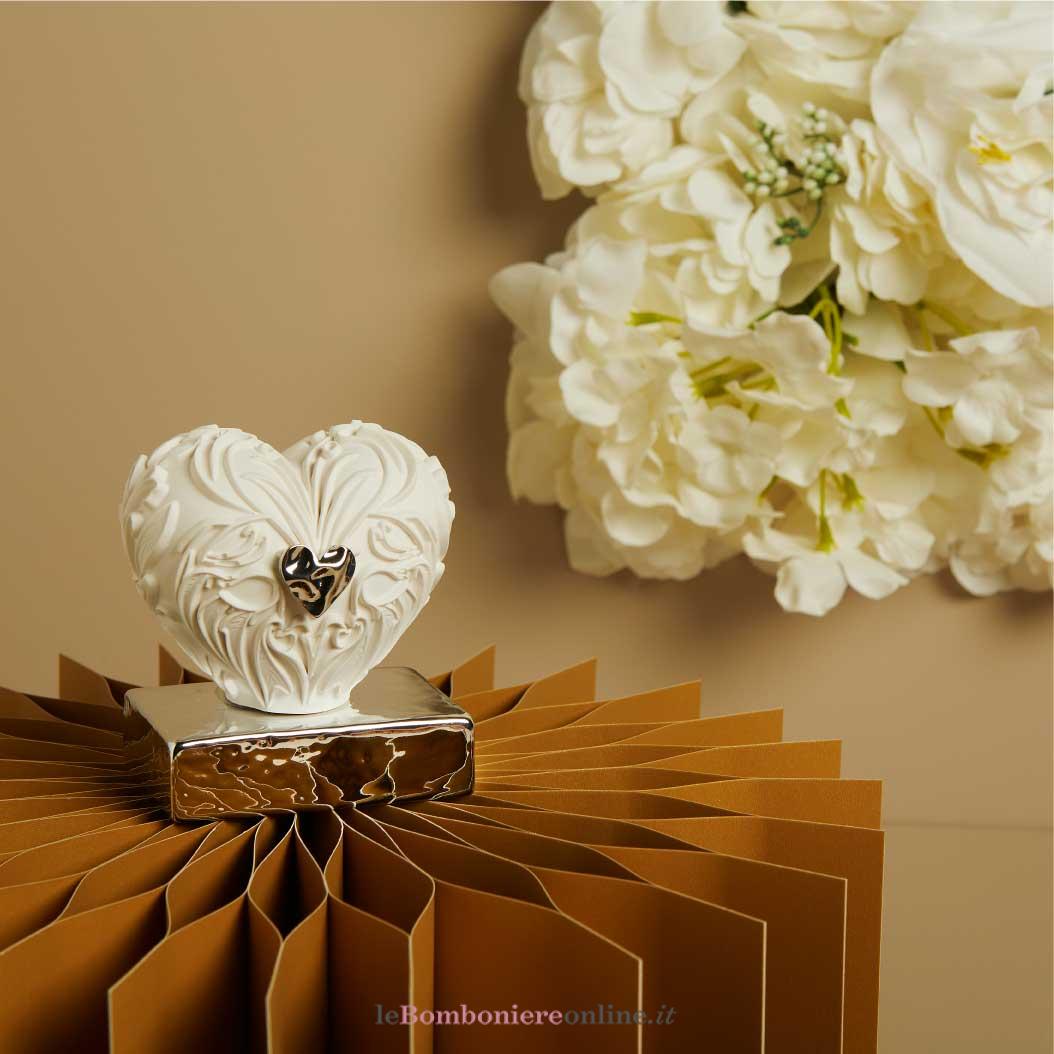 Cuore in gesso bianco con applicazione cuore su base porcellana silver, 7.6 x 9 x 5.5 cm, completo di porta confetti in tessuto con bottone madreperlato. Il prezzo indicato include la confezione con nastri in doppio raso, organza, o una combinazione di entrambe i materiali.