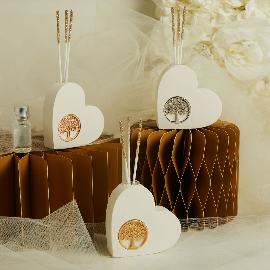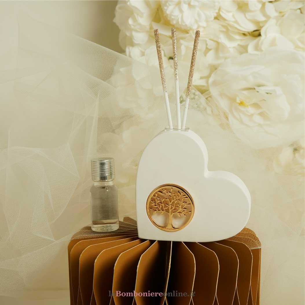 Diffusore cuore in gesso con applicazione albero della vita oro, 9.5 x 9.5 x 2.5 cm, kit essenza inclusa, completo di porta confetti in tessuto con bottone madreperlato. Il prezzo indicato include la confezione con nastri in doppio raso, organza, o una combinazione di entrambe i materiali.