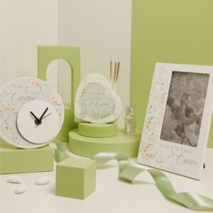 Diffusore cuore in gesso con decoro floreale verde e frase “Fai solo ciò che ti dice il cuore”, kit essenza incluso, 10,7 x 11 x 3,5 cm, completo di porta confetti in tessuto con bottone madraperlato. Il prezzo indicato include la confezione con nastri in doppio raso, organza, o una combinazione di entrambe i materiali.