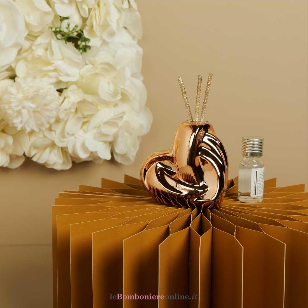 Diffusore cuore in porcellana oro rosa, 8.4 x 4.7 x 8 cm, kit essenza con midollini glitterati incluso, completo di porta confetti in tessuto con bottone madreperlato. Il prezzo indicato include la confezione con nastri in doppio raso, organza, o una combinazione di entrambe i materiali.