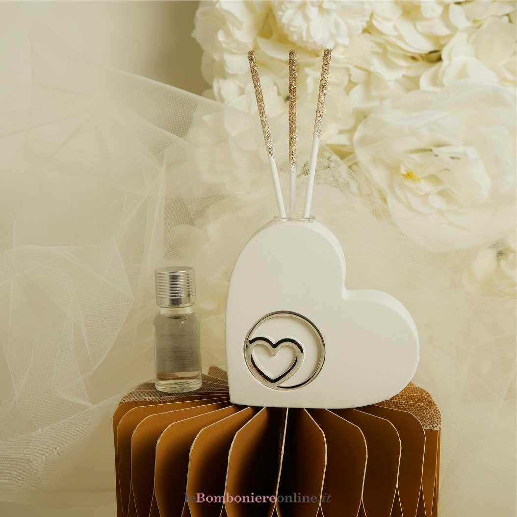 Diffusore cuore in gesso con applicazione cuore silver, 9.5 x 9.5 x 2.5 cm, kit essenza inclusa, completo di porta confetti in tessuto con bottone madreperlato. Il prezzo indicato include la confezione con nastri in doppio raso, organza, o una combinazione di entrambe i materiali.