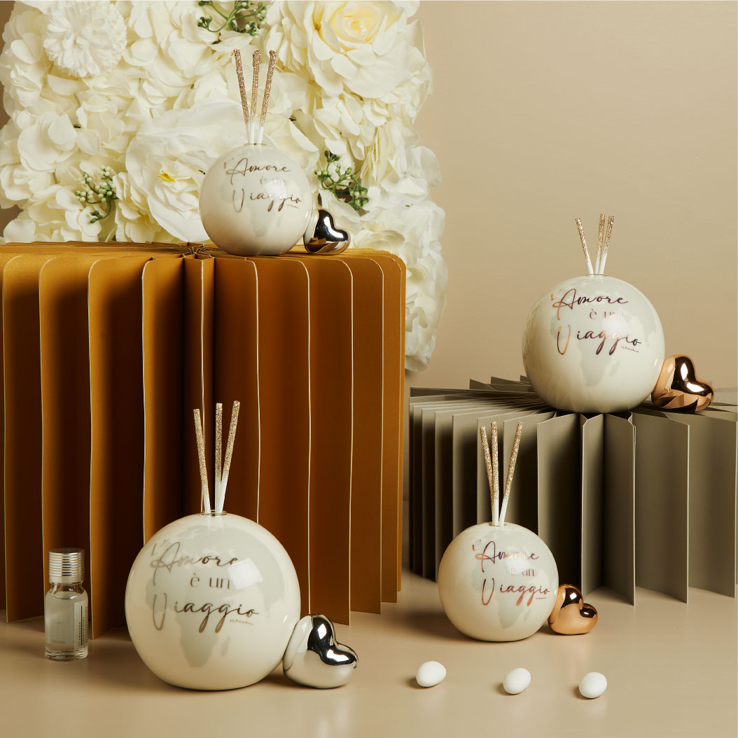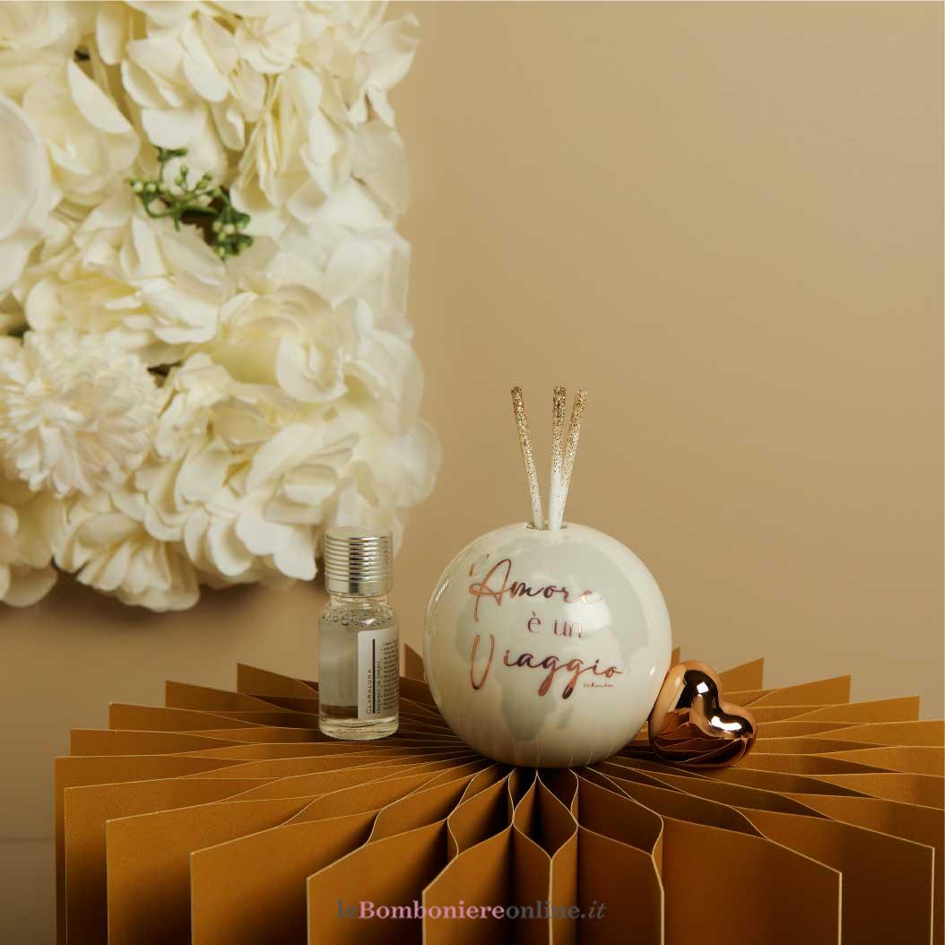 Diffusore globo in porcellana bianca con decoro mondo e frase “L’Amore è un viaggio” + cuore oro rosa, 9.5 x 9 x 6 cm, kit essenza con midollini glitterati incluso, completo di porta confetti in tessuto con bottone madreperlato. Il prezzo indicato include la confezione con nastri in doppio raso, organza, o una combinazione di entrambe i materiali.