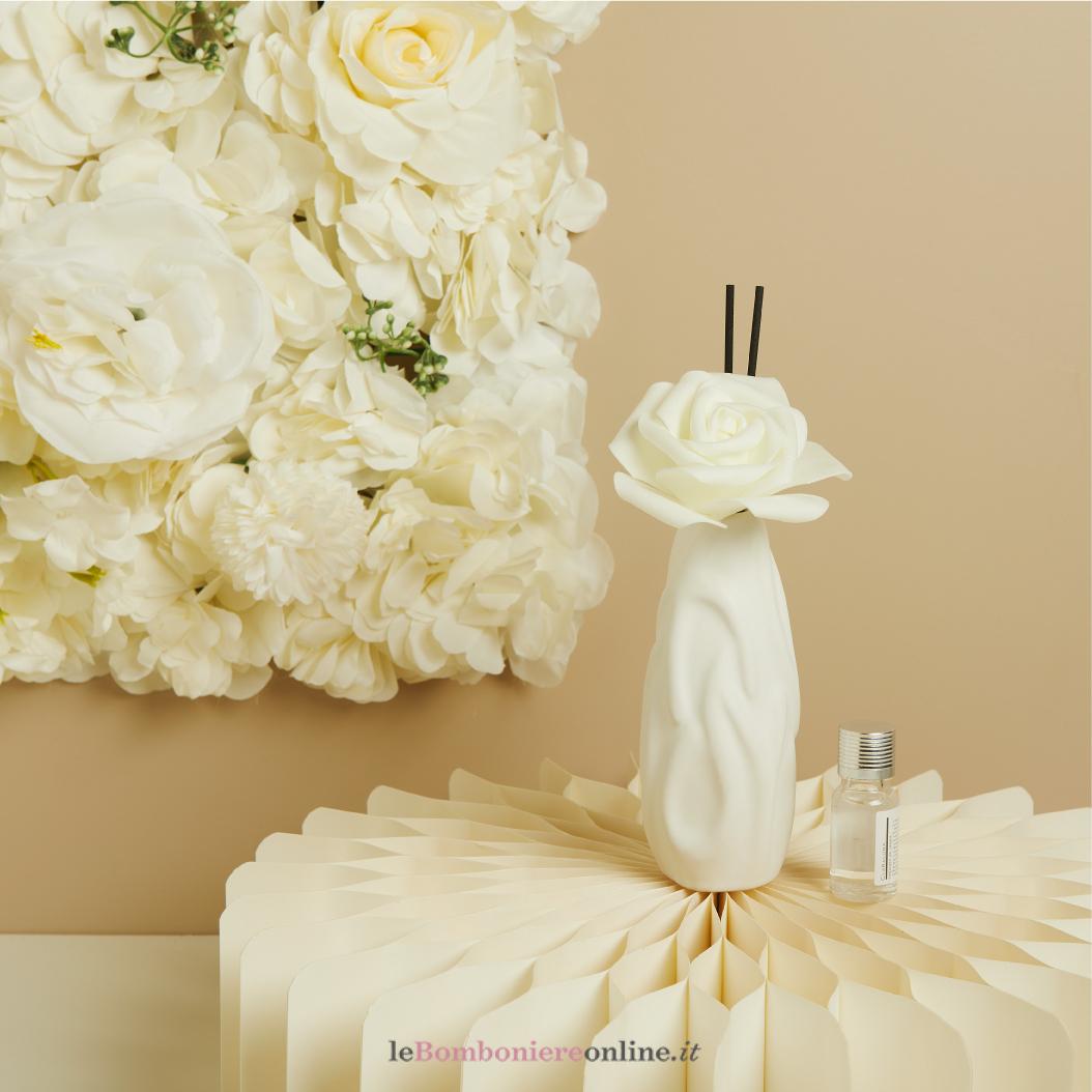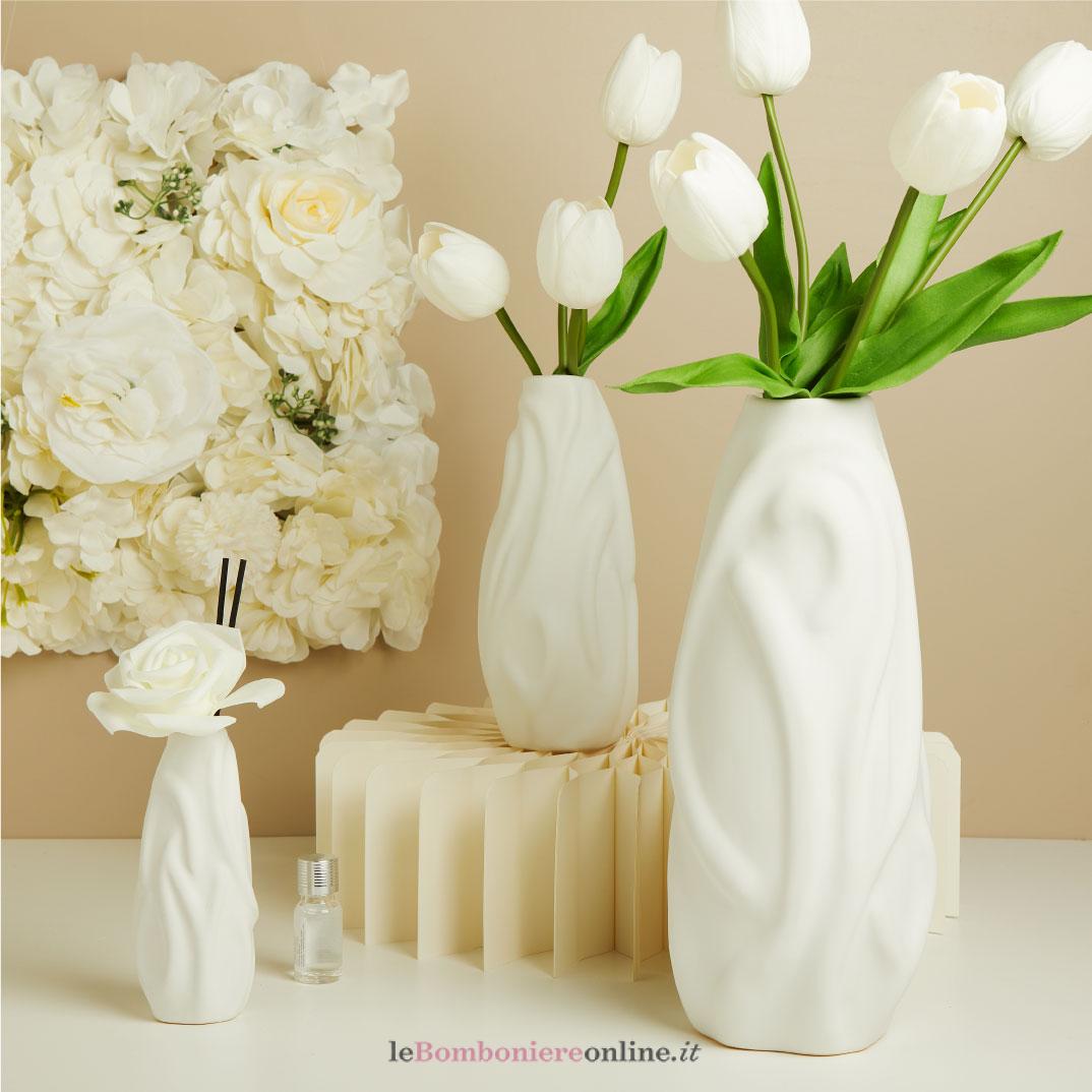 Vaso in porcellana onde, 6.5 x 6 x 14 cm, kit profumo e fiore incluso, completo di porta confetti in tessuto con bottone madreperlato. Il prezzo indicato include la confezione con nastri in doppio raso, organza, o una combinazione di entrambe i materiali.