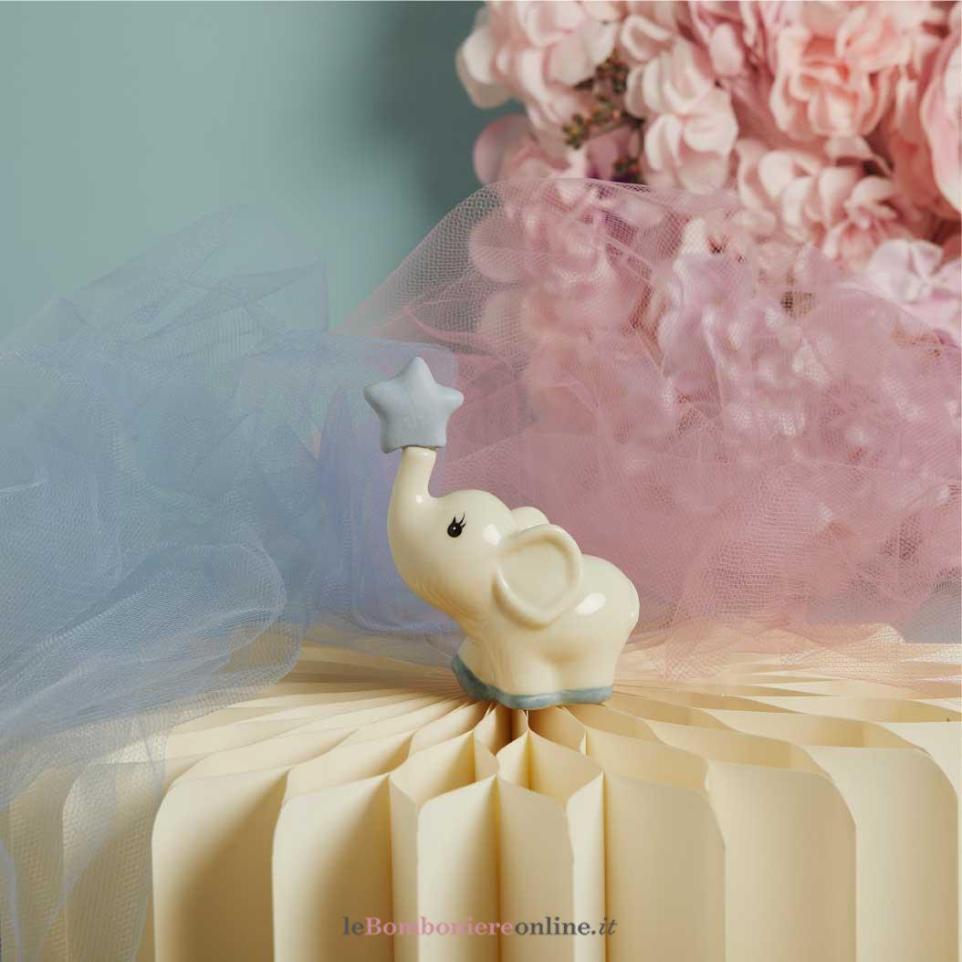 Elefantino in porcellana bianca e dettagli in azzurro, 6.5 x 4 x 9 cm, completo di porta confetti. Il prezzo indicato include la confezione con nastri in doppio raso, organza, o una combinazione di entrambe i materiali.
