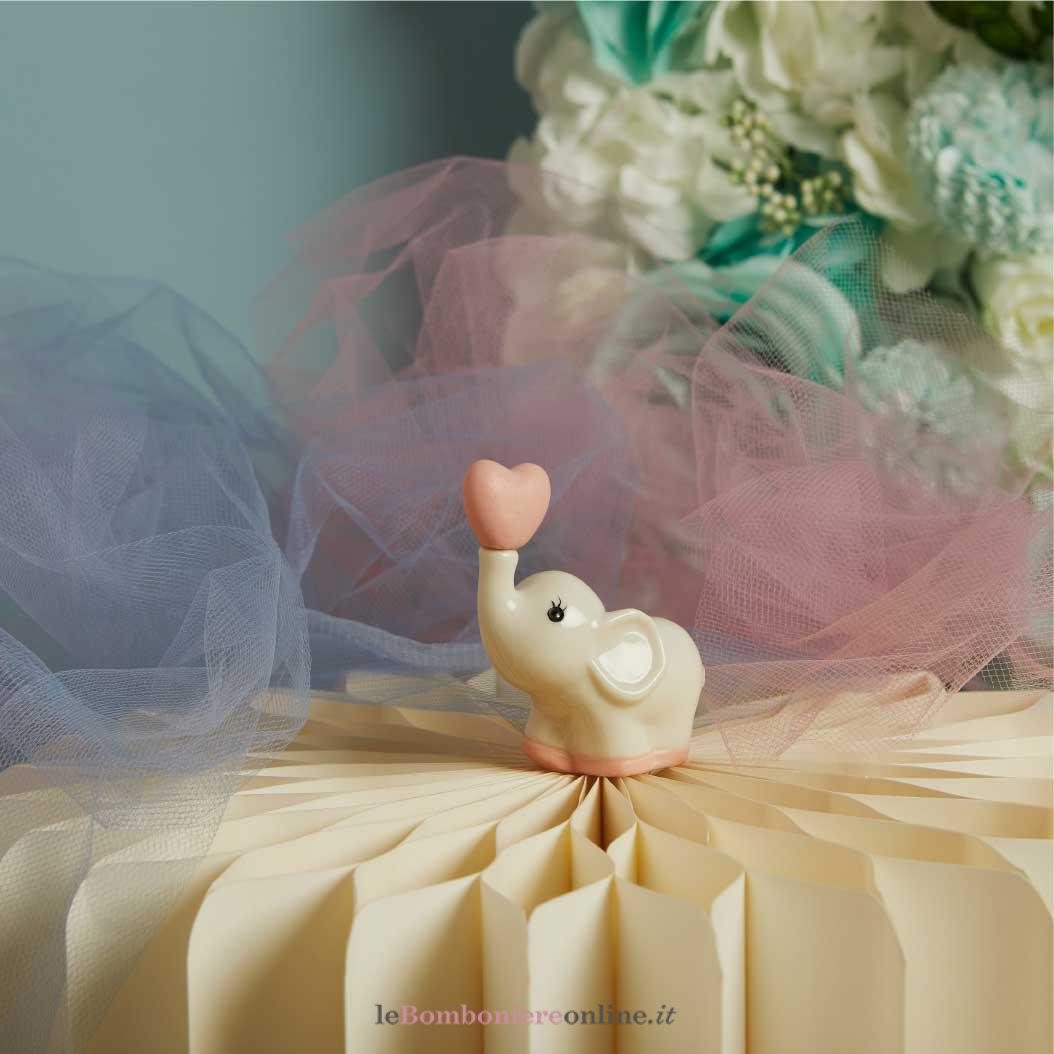 Elefantino in porcellana bianca con dettagli rosa, 6 x 3.3 x 7.5 cm, completo di confezione. Il prezzo indicato include la confezione con nastri in doppio raso, organza, o una combinazione di entrambe i materiali.