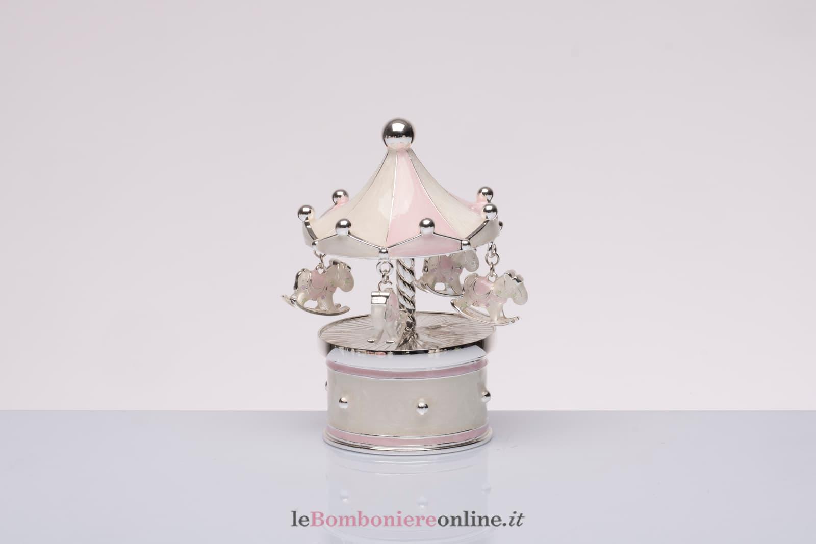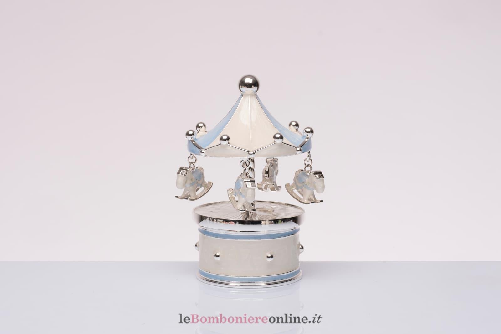 Giostrina carillon, cm Ø 8 x 13 H, disponibile in azzurro e rosa, compresa di sacchetto porta confetti e scatola regalo Morena Design. Il prezzo include la confezione con nastri in doppio raso, organza, o una combinazione di entrambe i materiali.