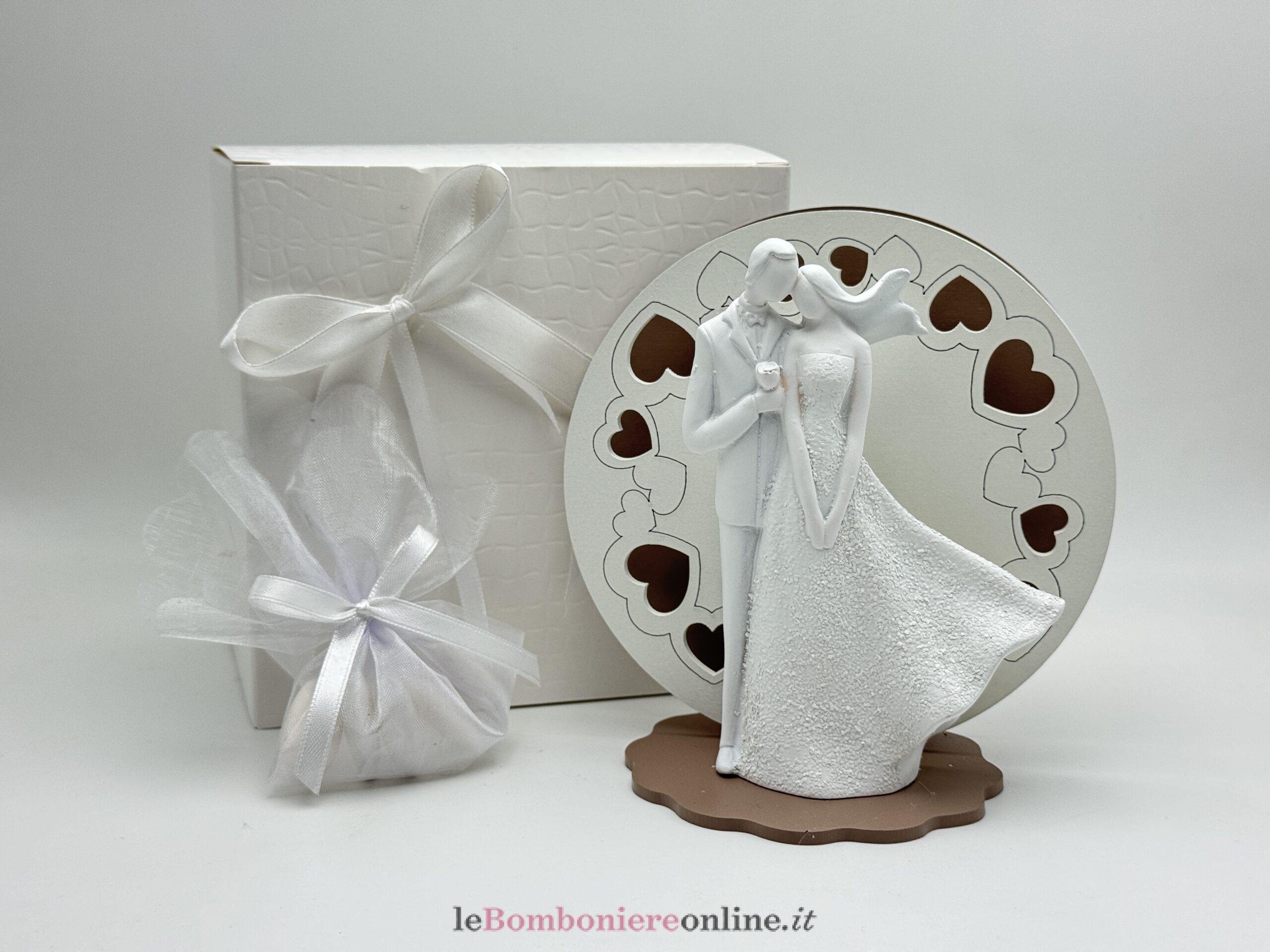 Lampada led con coppia sposi in resina bianca su base in legno taglio laser, colore fango (disponibile base colore sabbia, fango, ottanio e verde salvia), cm 14 x 9.5 x 14 H, completo di portaconfetti con confetti e scatola. Il prezzo indicato include la confezione con nastri in doppio raso o organza, o una combinazione di entrambe i materiali.
