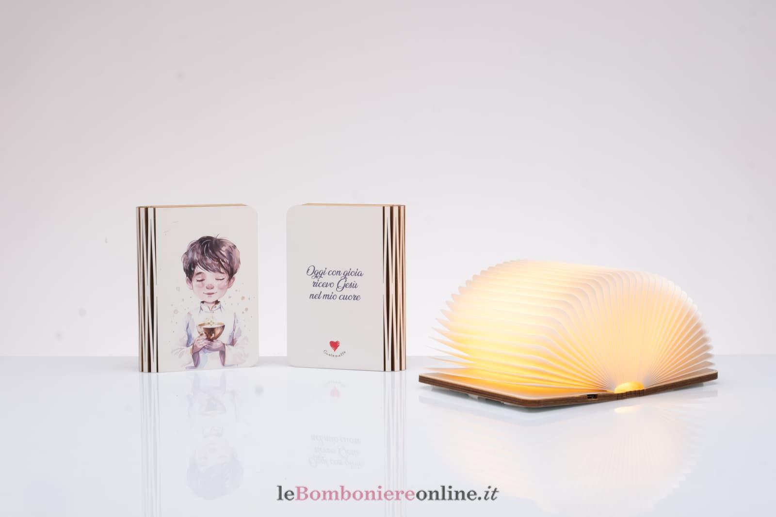 Libro luminoso con lampada led ricaricabile con cavo di ricarica USB tipo C, copertina in legno con decoro bambino Comunione, interno in carta Kraft resistente a umidità con luce bianca calda – bianca fredda – multicolore, cm 12 x 9, completo di confezione e scatola regalo Cuorematto.
