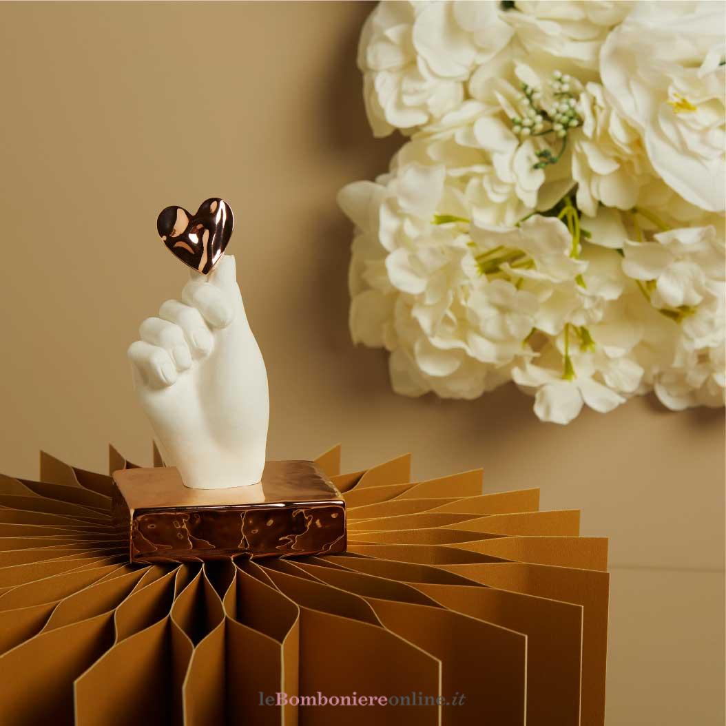 Mano in gesso bianco con applicazione cuore su base porcellana oro rosa (disponibile base silver e oro), 7.6 x 13 x 5.2 cm, completa di porta confetti in tessuto con bottone madreperlato. Il prezzo indicato include la confezione con nastri in doppio raso, organza, o una combinazione di entrambe i materiali.