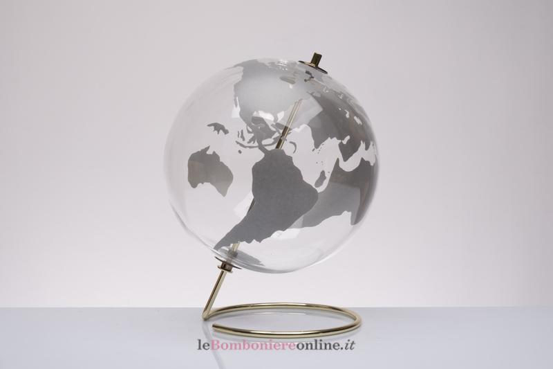 Mappamondo in vetro borosilicato con supporto in ottone, cm 20 Ø. Il prezzo indicato include la confezione con nastri in doppio raso, organza, o una combinazione di entrambe i materiali.