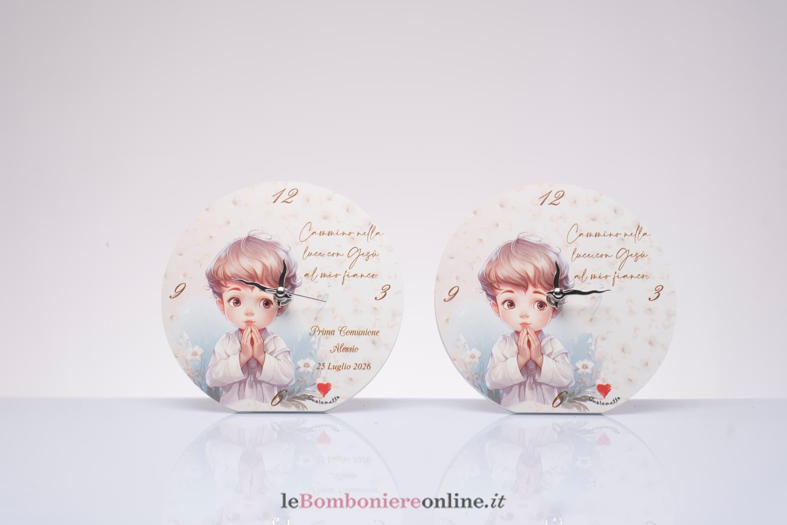 Orologio tondo, decoro Comunione maschio con scritta “Cammina nella luce con Gesù al mio fianco”, personalizzazione gratuita per quantità a partire da 10 pezzi/codice, cm Ø 15, completo di confezione e scatola regalo Cuorematto.