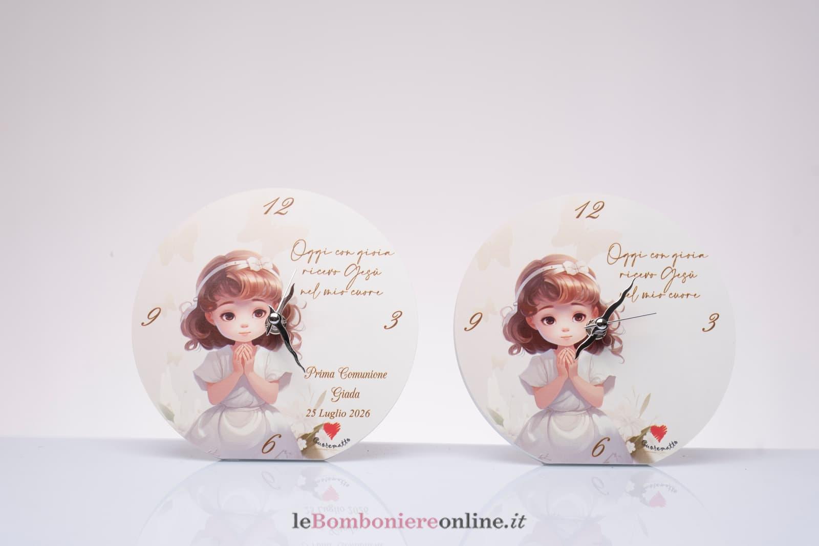 Orologio tondo, decoro Comunione femmina, personalizzazione gratuita per quantità a partire da 10 pezzi/codice, cm Ø 15, completo di confezione e scatola regalo Cuorematto..