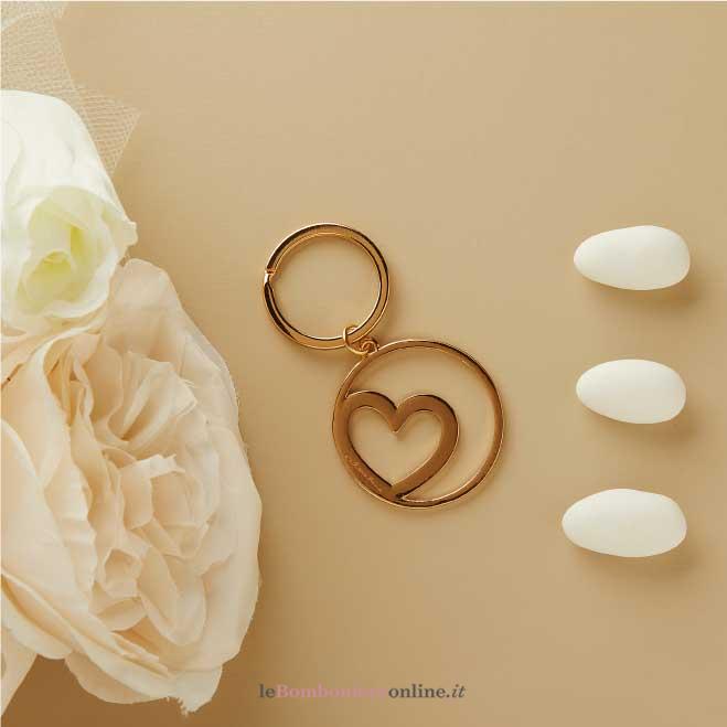 Portachiavi in acciaio oro con cuore , anello Ø 3 cm – L. 7.5 cm, completo di confezione.
