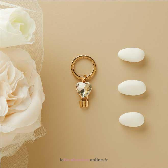 Portachiavi mongolfiera in acciaio oro con cuore, anello Ø 2.5 cm – L. 5.5 cm, completo di confezione.