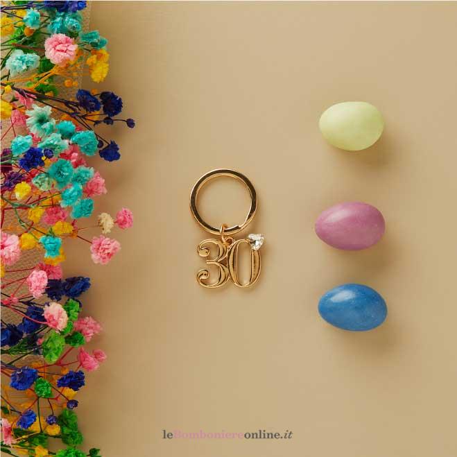 Portachiavi in acciaio oro con NR. 30, anello Ø 2.5 cm – L. 5.5 cm, completo di confezione.