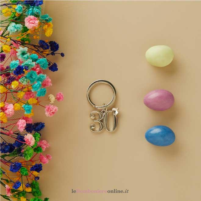 Portachiavi in acciaio silver con NR. 30, anello Ø 2.5 cm – L. 5.5 cm, completo di confezione.