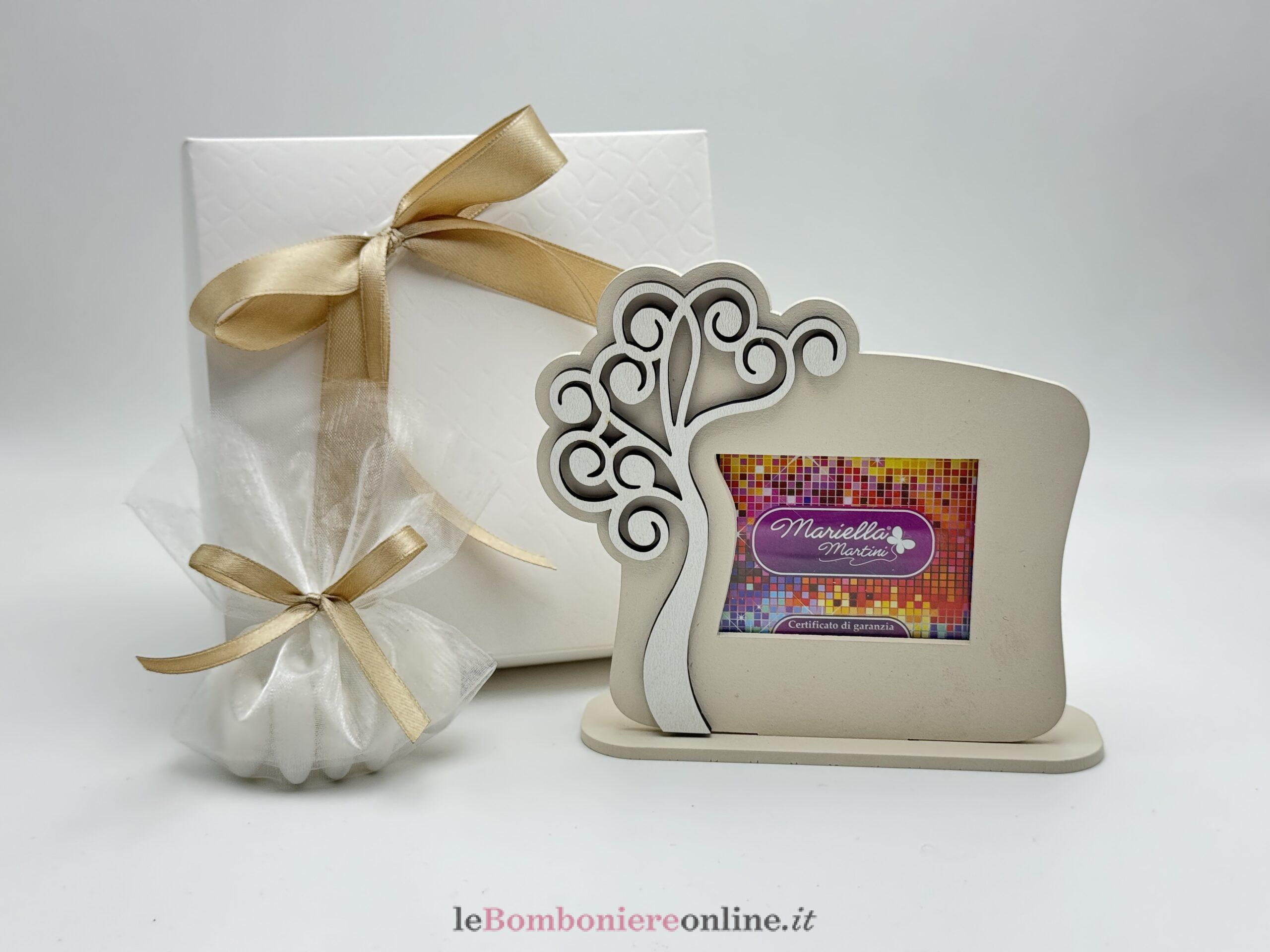 Portafoto in legno taglio laser con decoro albero della vita, colore sabbia (disponibile colore sabbia, fango, ottanio e verde salvia), cm 12.5 x 4 x 12 H, completo di portaconfetti con confetti e scatola. Il prezzo indicato include la confezione con nastri in doppio raso o organza, o una combinazione di entrambe i materiali.