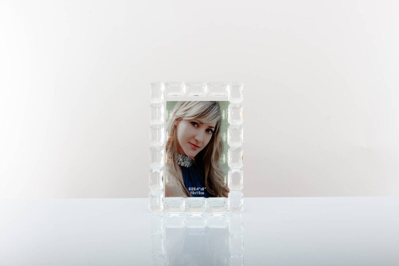 Portafoto in cristallo, cm 10 x 15 interno, compreso di sacchetto porta confetti e la scatola regalo Morena Design. Il prezzo include la confezione con nastri in doppio raso, organza, o una combinazione di entrambe i materiali.