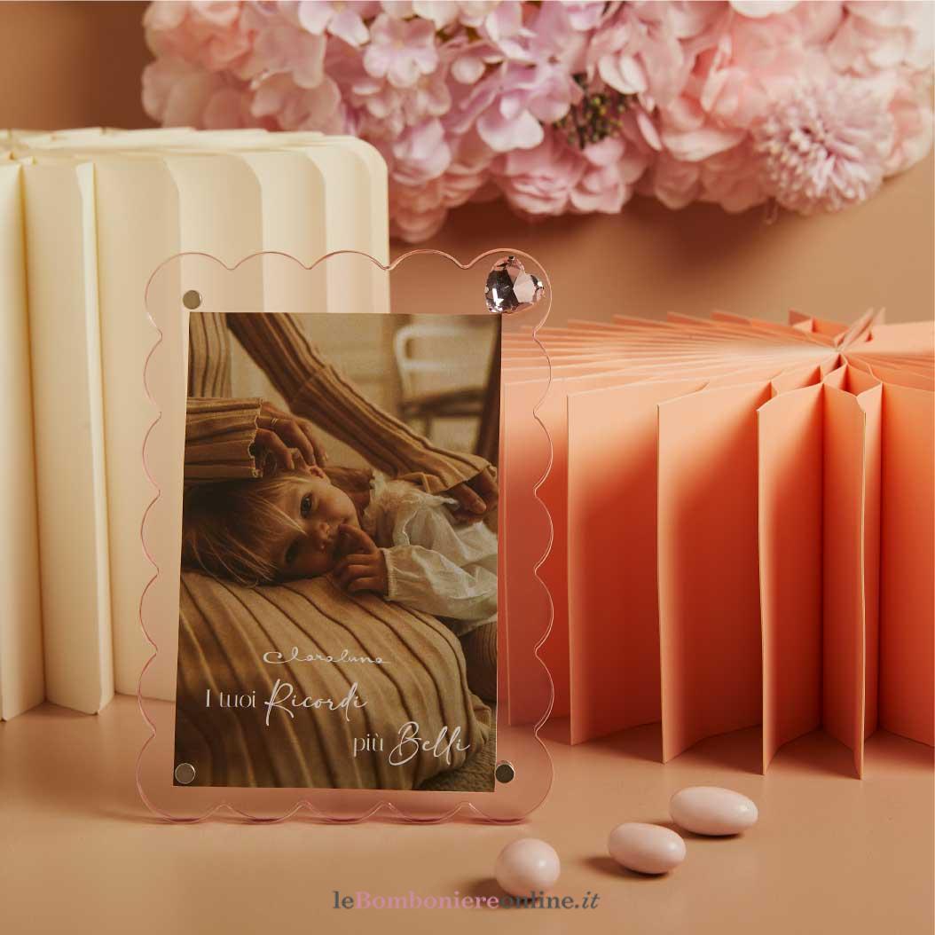 Portafoto nuvoletta rosa in plexiglass con applicazione magnete cuore rosa, p.foto 18.2 x 13.1 cm – fotografia 10 x 15 cm, completo di porta confetti in tessuto con bottone madreperlato. Il prezzo indicato include la confezione con nastri in doppio raso, organza, o una combinazione di entrambe i materiali.