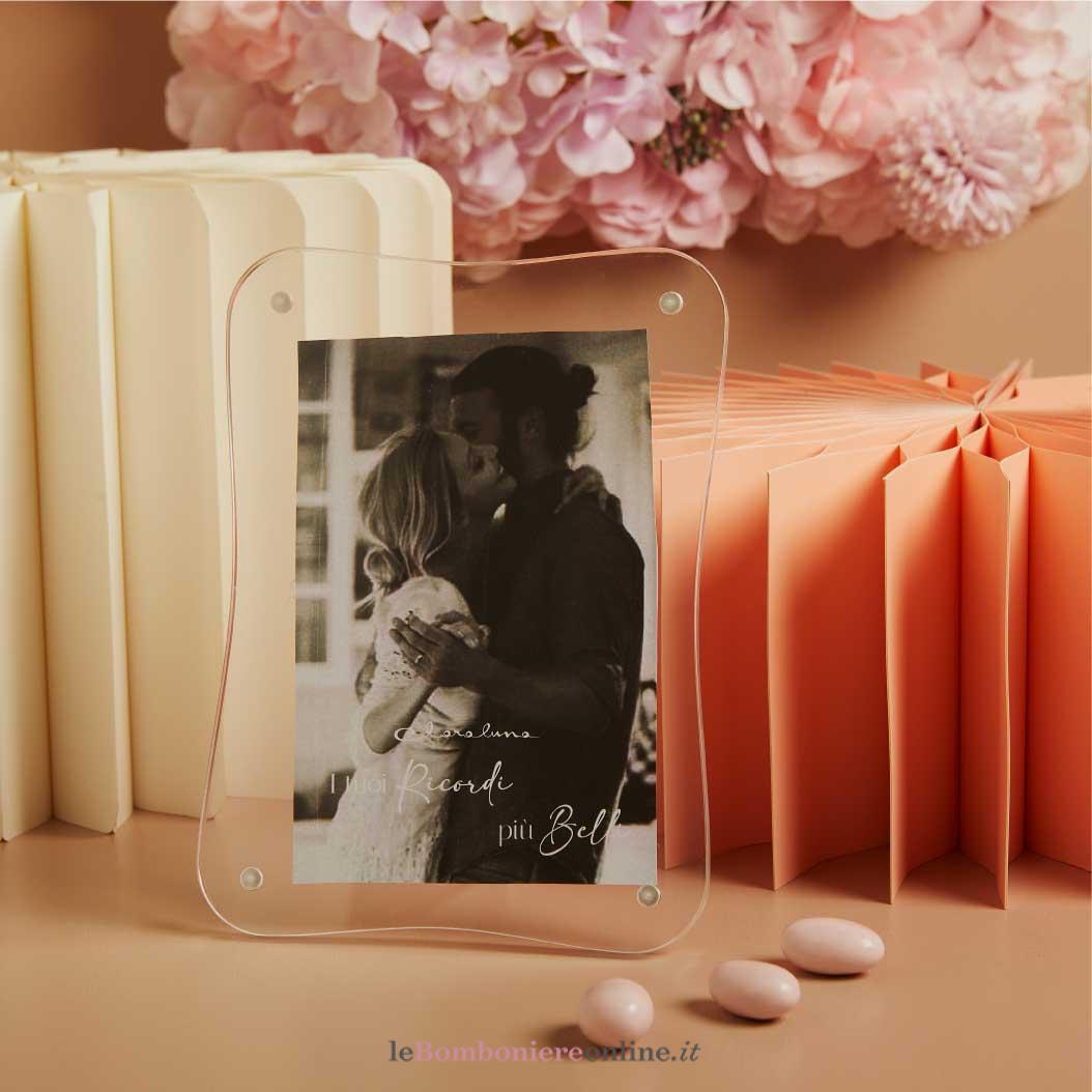 Portafoto ondulato bianco in plexiglass, p.foto 19.3 x 14.2 cm – fotografia 10 x 15 cm, completo di porta confetti in tessuto con bottone madreperlato. Il prezzo indicato include la confezione con nastri in doppio raso, organza, o una combinazione di entrambe i materiali.
