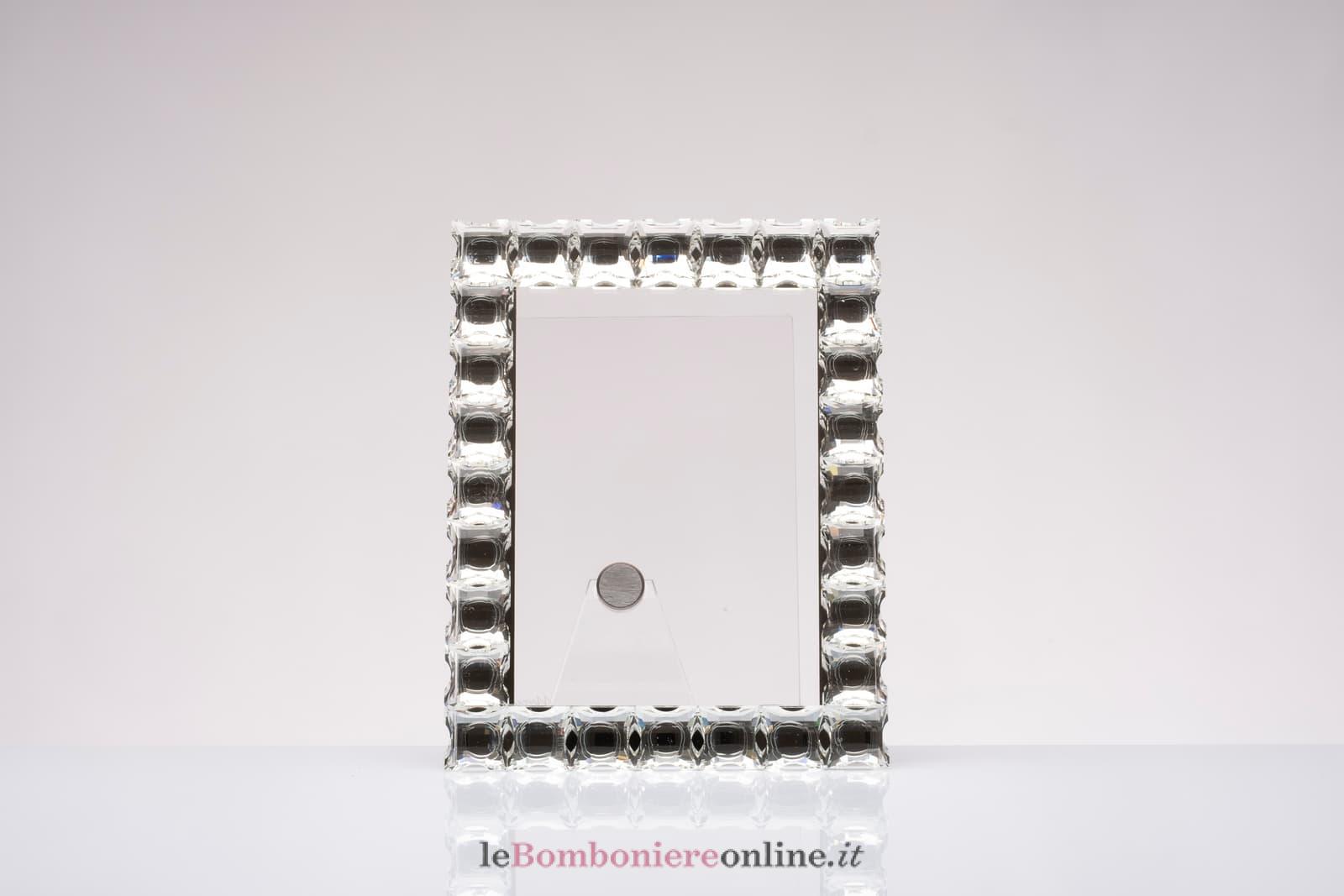 Portafoto in cristallo specchiato, cm 10 x 15, compreso di sacchetto porta confetti e la scatola regalo Morena Design. Il prezzo include la confezione con nastri in doppio raso, organza, o una combinazione di entrambe i materiali.