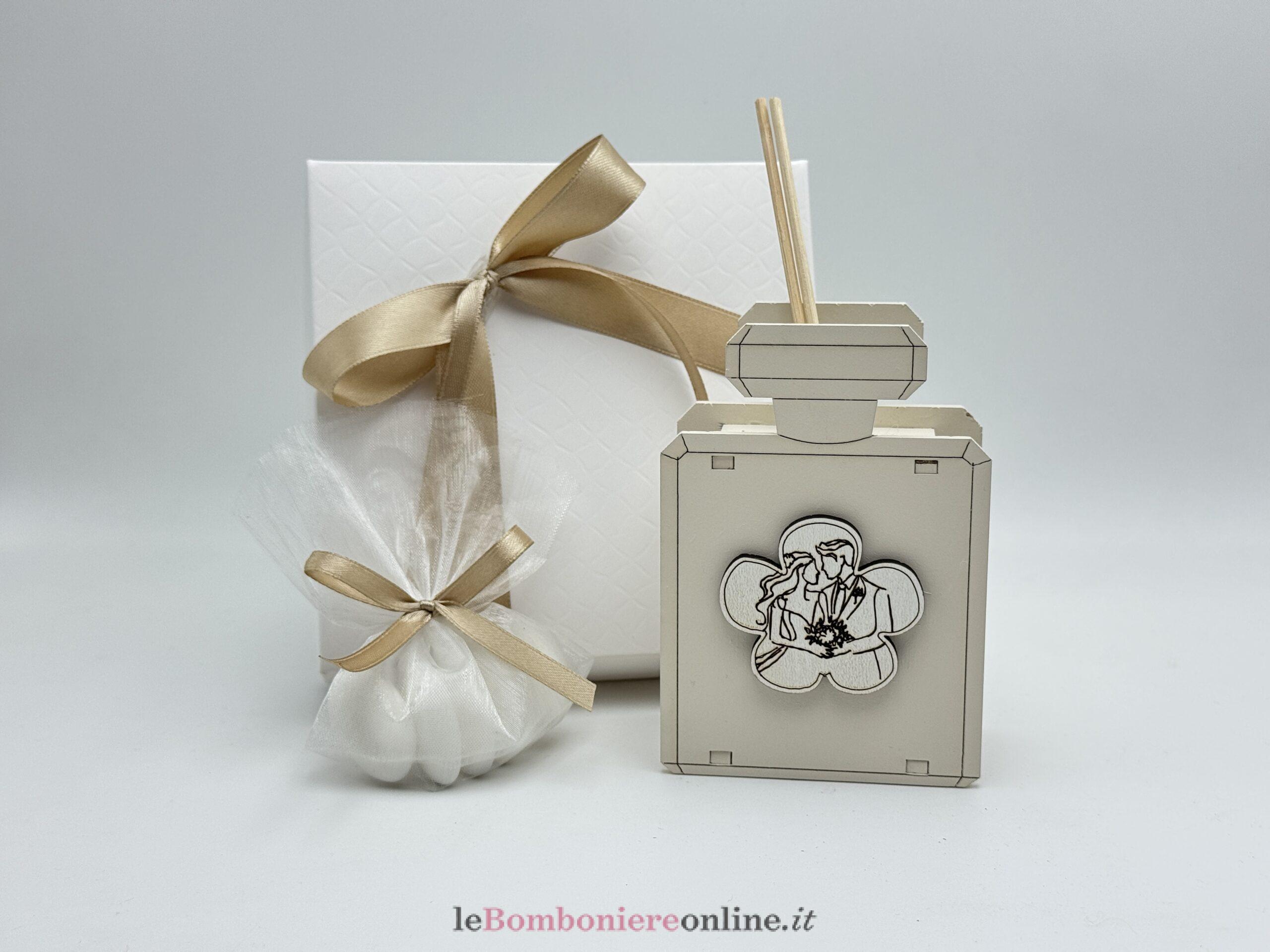 Profumatore in legno taglio laser, decoro coppia sposi, colore sabbia, cm 7.5 x 4.5 x 11 H, completo di portaconfetti con confetti e scatola. Il prezzo indicato include la confezione con nastri in doppio raso o organza, o una combinazione di entrambe i materiali.