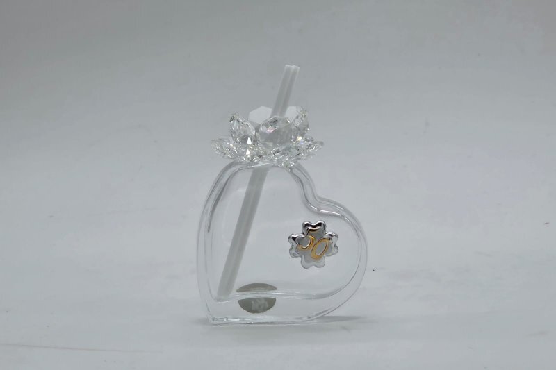 Profumatore in cristallo con midollini e applicazione 50° Anniversario, cm 7 x 9 H, compreso di sacchetto porta confetti e la scatola regalo Morena Design. Il prezzo include la confezione con nastri in doppio raso, organza, o una combinazione di entrambe i materiali.