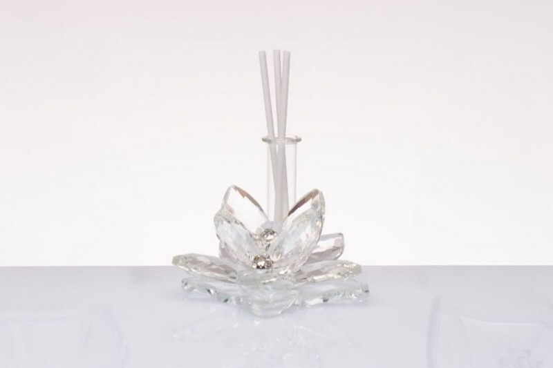 Profumatore fiore in cristallo con midollini, cm 8 x 8 x 7 H, compreso di sacchetto porta confetti e la scatola regalo Morena Design. Il prezzo include la confezione con nastri in doppio raso, organza, o una combinazione di entrambe i materiali.