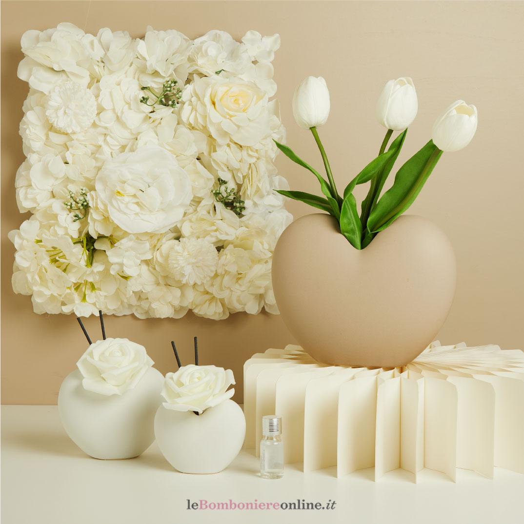 Profumatore in porcellana bianca a cuore, 13.5 x 6.5 x 10.8 cm, kit profumo e fiore incluso, completo di porta confetti in tessuto con bottone madreperlato. Il prezzo indicato include la confezione con nastri in doppio raso, organza, o una combinazione di entrambe i materiali.