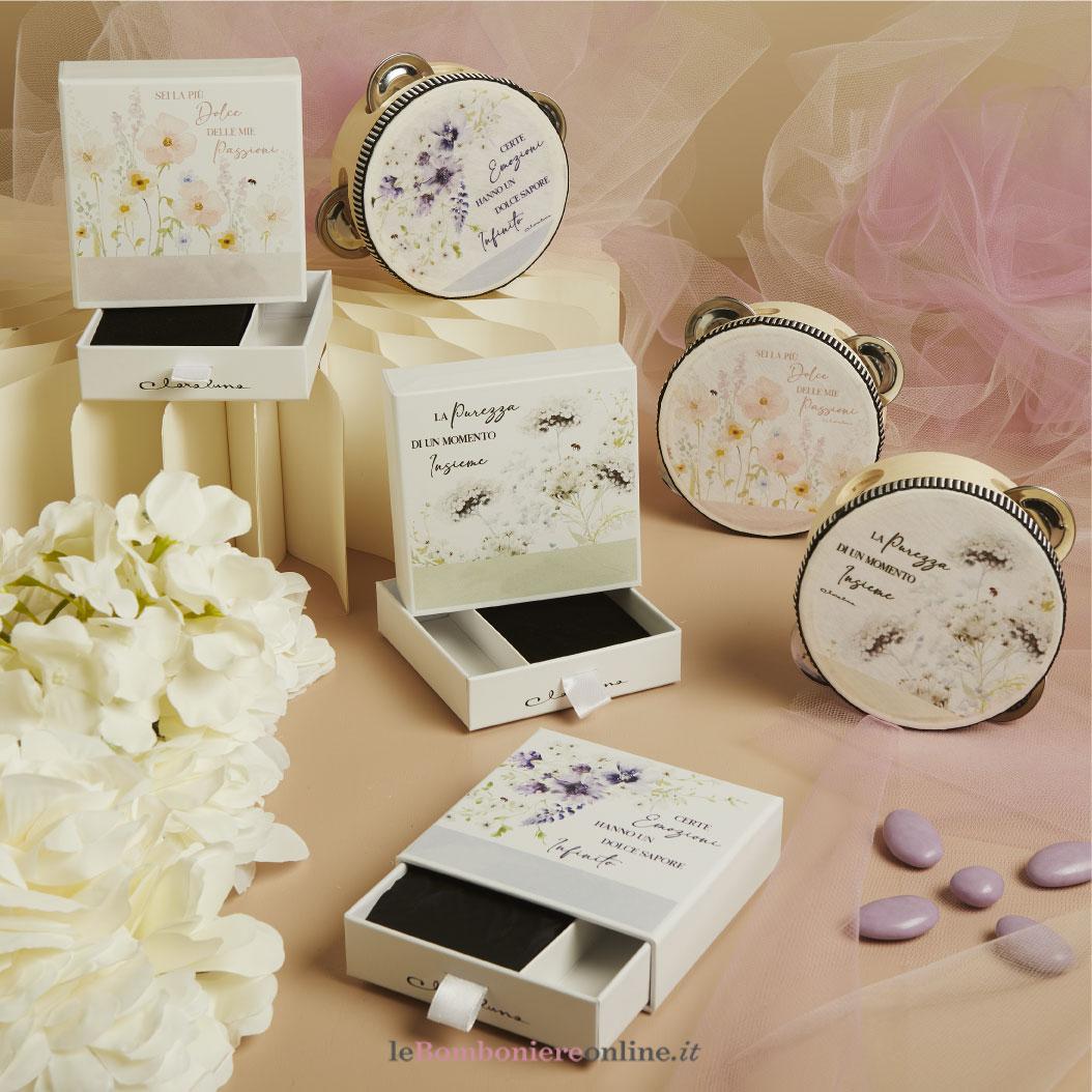 Ogni bomboniera è corredata di scatola e sacchetto, nastri e confetti. Per quanto riguarda la scelta della confezione potete optare sia tra quelle indicate nell’apposita sezione sia richiedere l’opzione “personalizzata”.