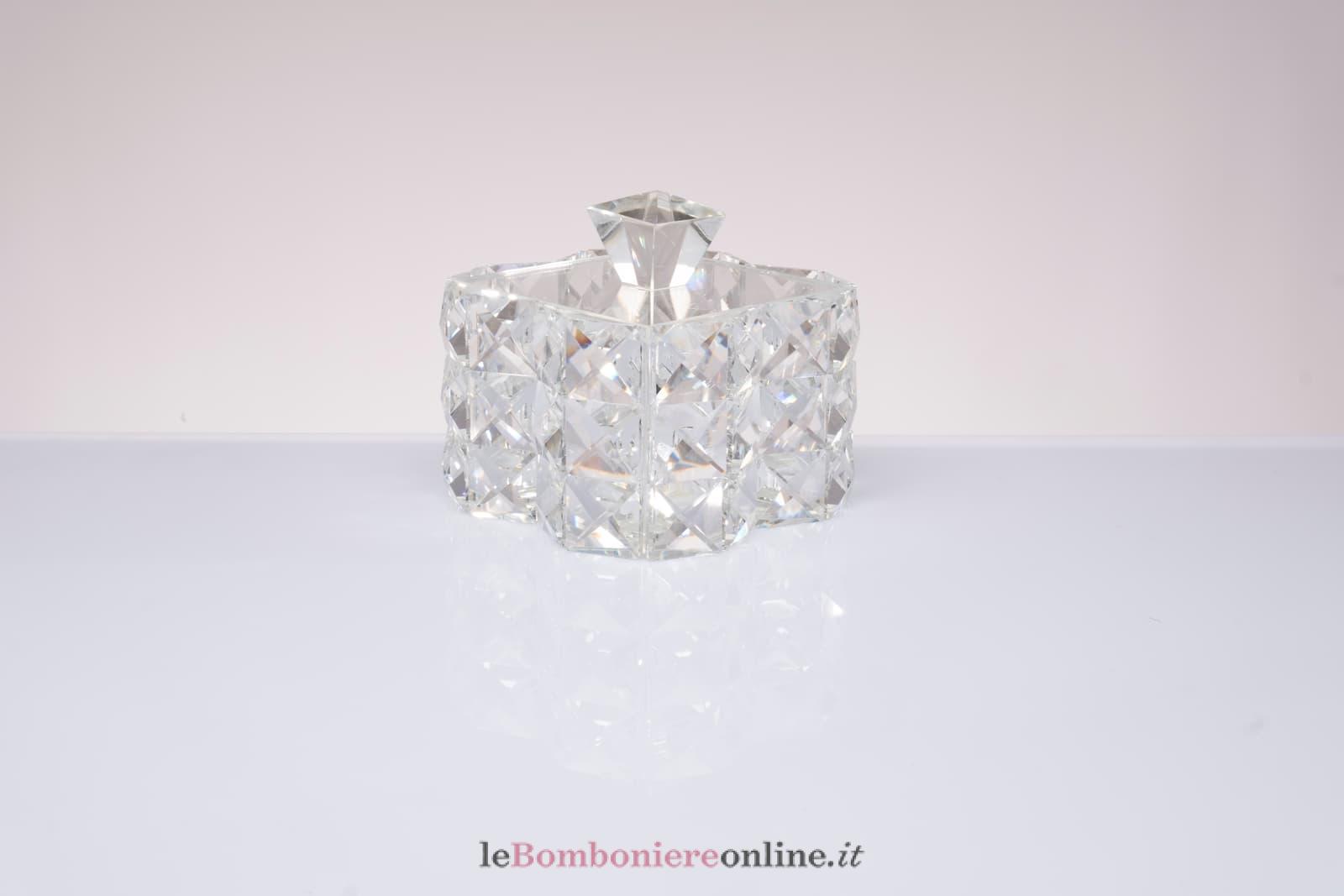 Scatola in cristallo quadrata, cm 10.5 x 9.5 H, compreso di sacchetto porta confetti e la scatola regalo Morena Design. Il prezzo include la confezione con nastri in doppio raso, organza, o una combinazione di entrambe i materiali.