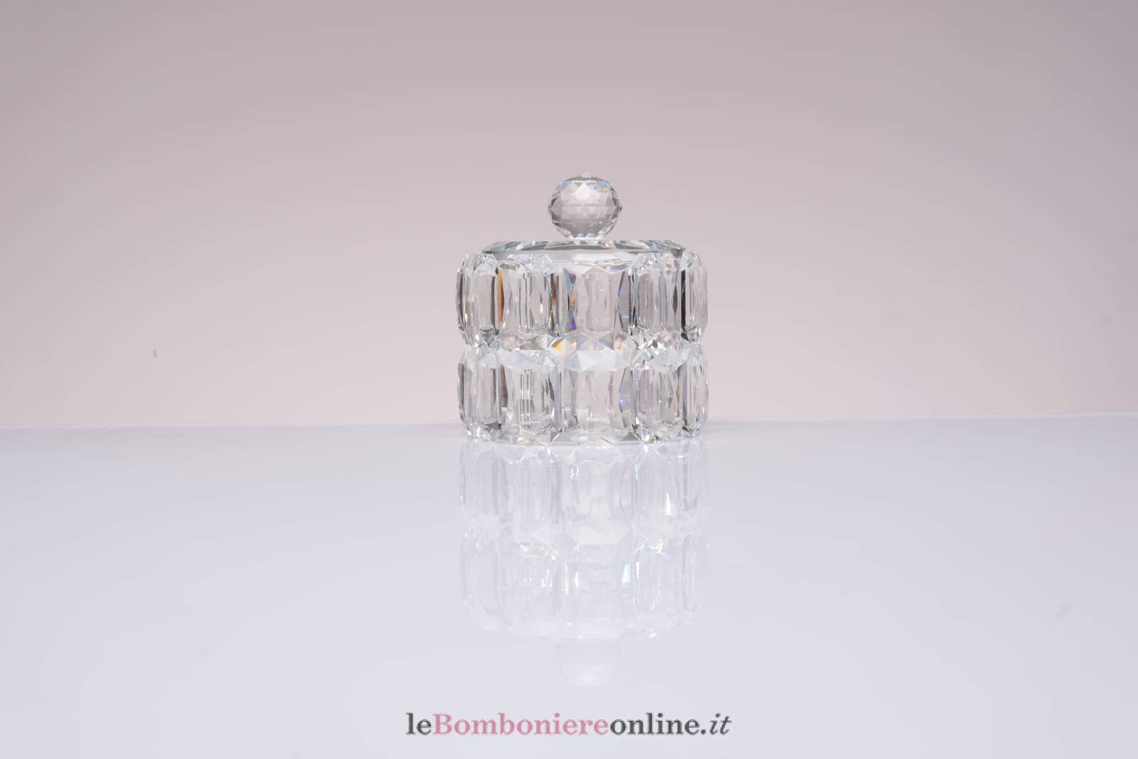 Scatola in cristallo tonda, cm Ø 7 x 7.5 H, compreso di sacchetto porta confetti e la scatola regalo Morena Design. Il prezzo include la confezione con nastri in doppio raso, organza, o una combinazione di entrambe i materiali.