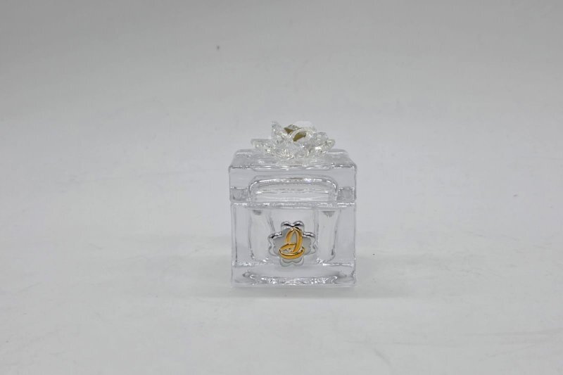 Scatola in cristallo con fiore e applicazione nozze, cm 5 x 5 x 5, compreso di sacchetto porta confetti e la scatola regalo Morena Design. Il prezzo include la confezione con nastri in doppio raso, organza, o una combinazione di entrambe i materiali.
