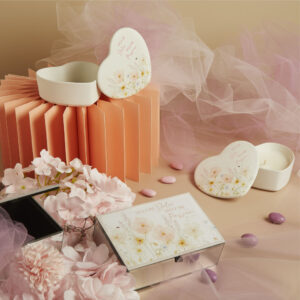 Scatola in porcellana cuore con decoro floreale rosa, 12 x 12 x 4.5 cm, completa di porta confetti in tessuto con bottone madreperlato e scatola Claraluna decoro botanica oro. Il prezzo indicato include la confezione con nastri in doppio raso, organza, o una combinazione di entrambe i materiali.