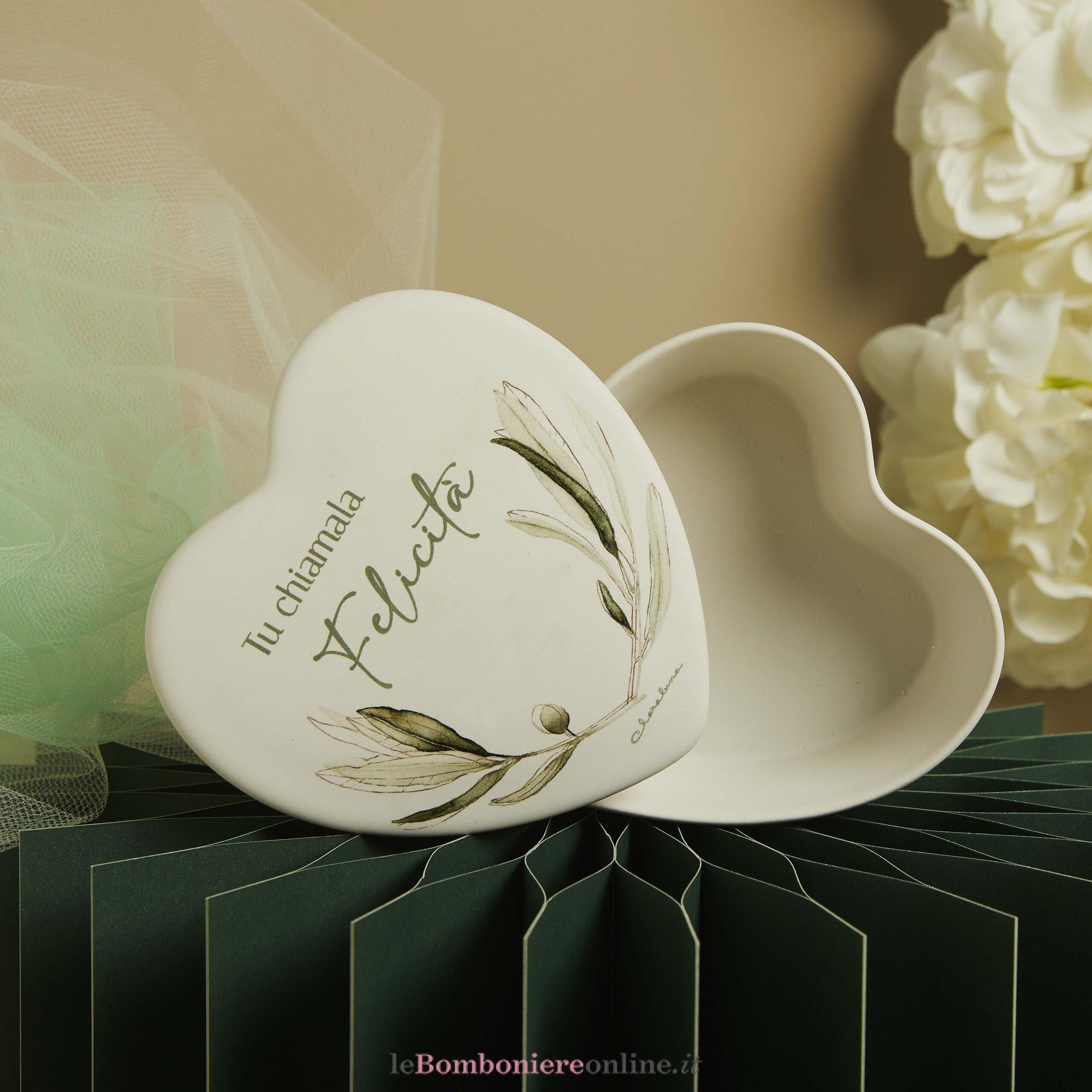 Scatola in porcellana cuore con decoro ulivo, 12 x 12 x 4.5 cm, completa di porta confetti in tessuto con bottone madreperlato. Il prezzo indicato include la confezione con nastri in doppio raso, organza, o una combinazione di entrambe i materiali.