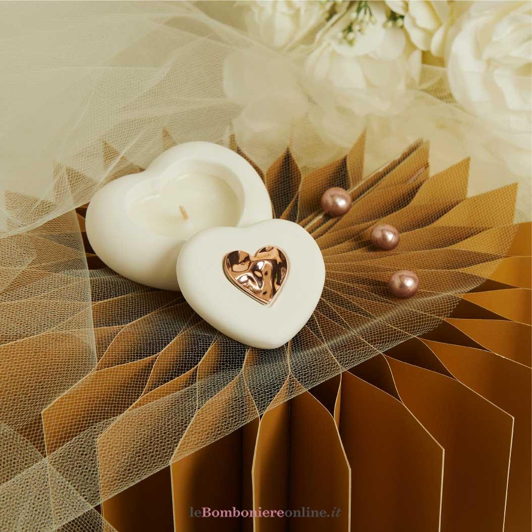 Scatolina cuore in gesso con applicazione cuore oro rosa e candela bianca 10 gr,(disponibile anche senza candela), 9 x 8.5 x 4 cm, completa di porta confetti in tessuto con bottone madreperlato. Il prezzo indicato include la confezione con nastri in doppio raso, organza, o una combinazione di entrambe i materiali.