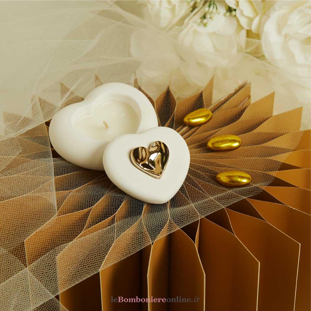 Scatolina cuore in gesso con applicazione cuore oro e candela bianca 10 gr,(disponibile anche senza candela), 9 x 8.5 x 4 cm, completa di porta confetti in tessuto con bottone madreperlato. Il prezzo indicato include la confezione con nastri in doppio raso, organza, o una combinazione di entrambe i materiali.