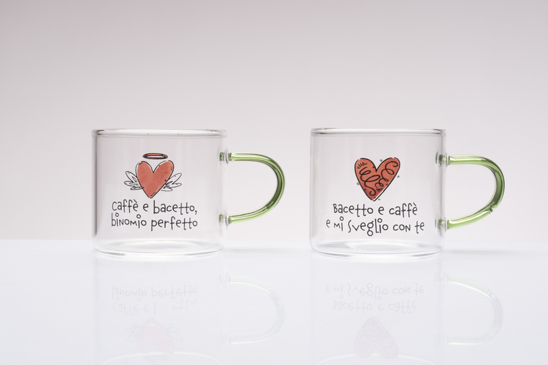 Set 2 tazzine caffè in vetro borosilicato, completo di sacchetto con confetti e scatola Cuorematto, cm Ø 5.5 x 5 H – ml 80. Il prezzo indicato include la confezione con nastri in doppio raso, organza, o una combinazione di entrambe i materiali.